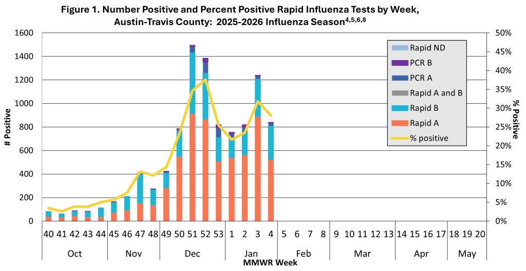 - Four influenza-associated outbreaks in a school or long-term care facility have been reported this season in Travis County.