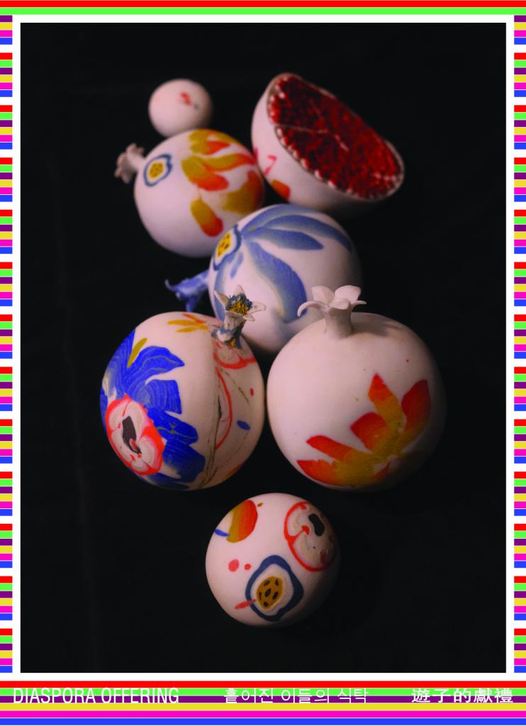 The AARC presents Diaspora Offering by Allen Yu and Sun-Jue Shin, on-view starting in early November 2025 in the AARC's Foyer Display Cases. In Diaspora Offering, Sun-Jue Shin and Allen Yu explore and provide a new world for traditional ceremonial objects and rituals to honor the deceased and sustain spiritual connection with generations past. In both Korean and Chinese cultures, fruits and flowers symbolize abundance and good fortune, reminders of heritage and tradition. In this installation, ceramic objects are reimagined through symbolic patterns and thoughtful arrangements, expressing a sense of displacement and the search for belonging. Created by two Asian artists living in Texas, these works are drawn from their shared experiences as drifters, distanced from their ancestral homelands.