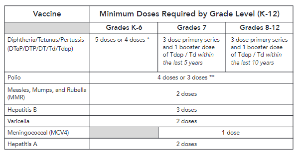 Please note that for grades K-6, five doses of the diphtheria-tetanus-pertussis vaccine are required. Four doses meet the requirement if the fourth dose was received on or after the child’s fourth birthday. For children at least 7 years old, three doses meet the requirement if one dose was received on or after the child’s fourth birthday. Additionally, four doses of the polio vaccine are required for grades K-12, but three doses meet the requirement if the third dose was received on or after the child’s fourth birthday.