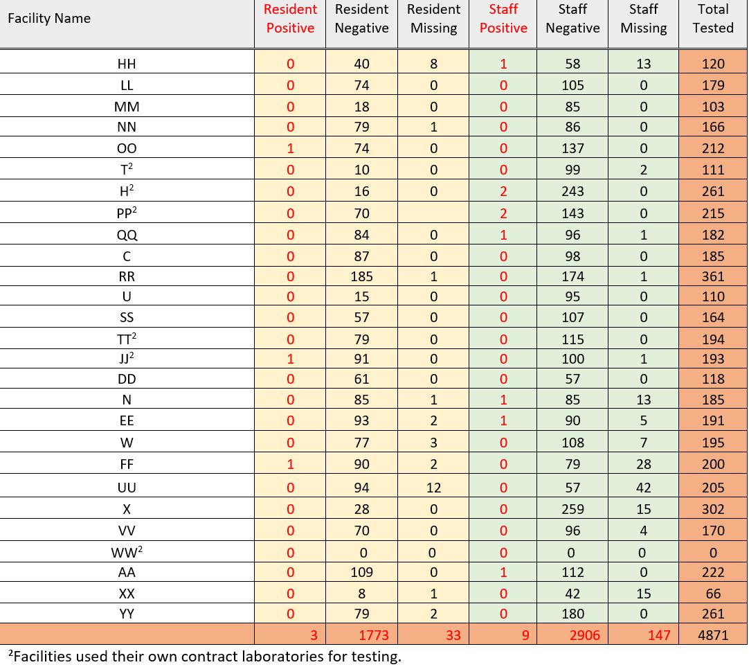 Results from nursing homes with ongoing COVID-19 transmission (see Table 2) shows one facility that had a 38 percent positivity rate among staff and residents and two other facilities with an approximately 11 percent positivity rate.