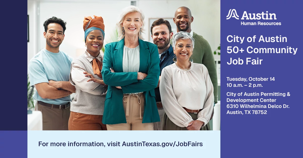The City of Austin’s 50+ Community Job Fair for individuals over 50 years old will be held on Tuesday, October 14, 2025, from 10:00 a.m. – 2:00 p.m. at the City of Austin Permitting and Development Center, 6310 Wilhelmina Delco Drive, Austin, TX 78752. The opening ceremony will start at 10:00 a.m. to welcome employers and job seekers.