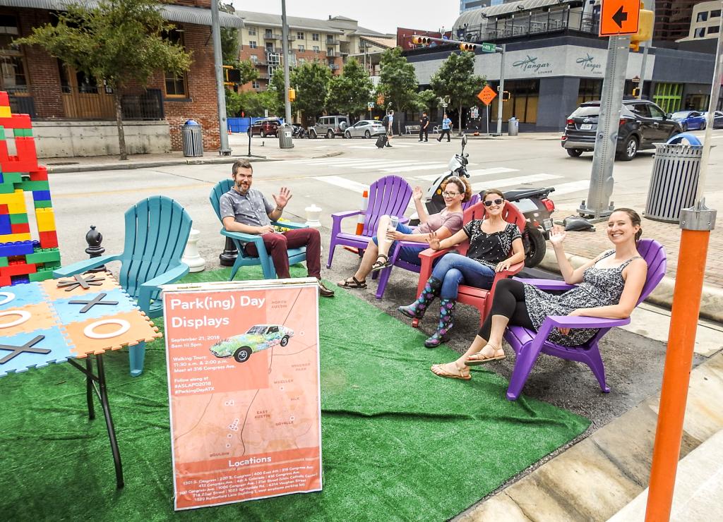 The Urban Design team encourages activation in the public realm to make cities more walkable, encourage socializing, and help local businesses by bringing more people to the area. One project the team worked on is participating in Park(ing) Day along Congress Avenue, where parking spots were transformed into active third-sapces for Austinties to relax and connect.