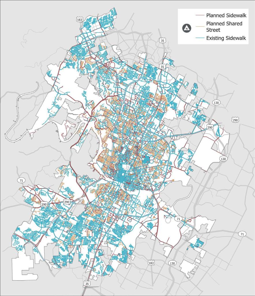 Pedestrian safety is defined as designing and operating streets in ways that reduce crashes between people walking and motor vehicle traffic. Pedestrian comfort includes enhancing the experience of walking through things like shade, art, and routes that are as direct and flat as possible. Comfort also includes addressing the perception of safety such as providing crossings that are short and low-stress, additional separation between sidewalks and motor vehicle traffic, and pedestrian lighting. Austin aspires to have a sidewalk and shared street network that connects the entire city and provides access to every property. There are existing gaps and missing links in the network. Installing sidewalks or shared streets to fill in the missing links is vital to provide pedestrian access for everyone and every destination throughout the entire city.