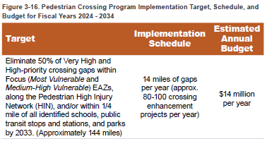 Identifying corridor segments where there are insufficient crossing opportunities is a two-part process. First, data are used to evaluate whether the treatments present at an existing pedestrian crossing are suitable for the context. Once suitability has been determined, the distances between suitable crossings can be measured to identify gaps. Crossing gaps are then quantified and prioritized to form a build-out plan for pedestrian crossings that identifies the necessary funding level to achieve the target of eliminating 50% of Very High and High priority crossing gaps within Focus EAZs, along the Pedestrian High Injury Network (HIN), or within a 1/4 mile of all identified schools, public transit stops and stations, and parks by 2033.