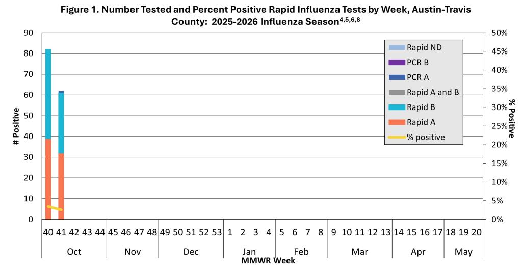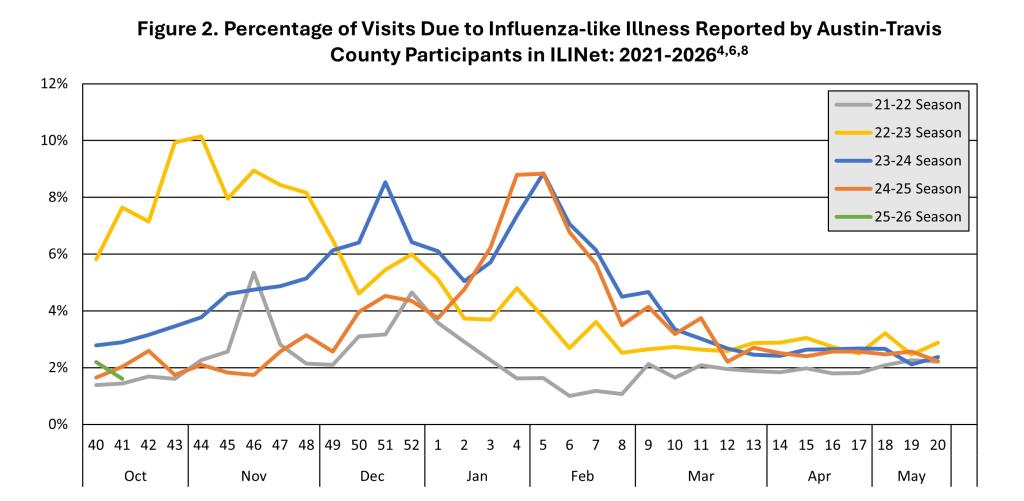 - No influenza-associated outbreaks in schools or long-term care facilities have been reported this season in Travis County.