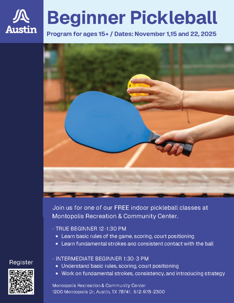 • Beginner Pickleball Program for ages 15+, November 1, 15, and 22, 2025