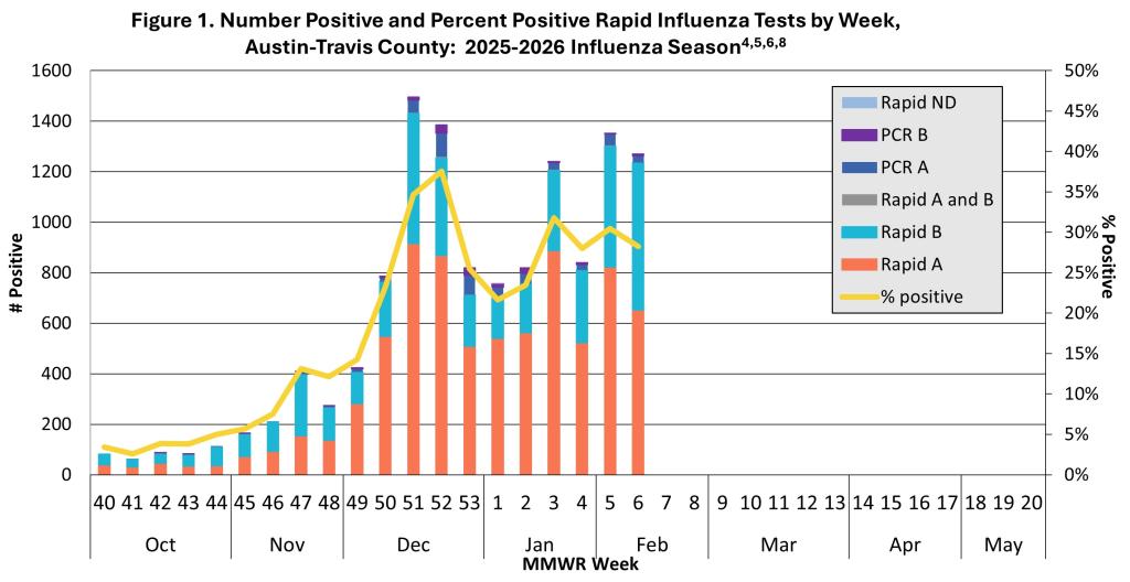 - Five influenza-associated outbreaks in a school or long-term care facility have been reported this season in Travis County.