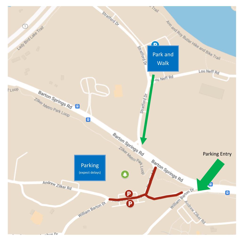 Parking: Pre-paid vehicle parking passes are required in advance and include specific access route directions. There is NO on site parking access from Barton Springs Road or other areas of the park.  All pre-paid parking entry is from the Mopac side of the event.