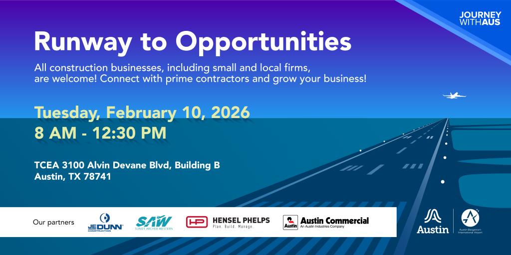 Join Austin-Bergstrom International Airport (AUS) to learn about subcontracting construction opportunities as part of the Journey With AUS airport expansion program.