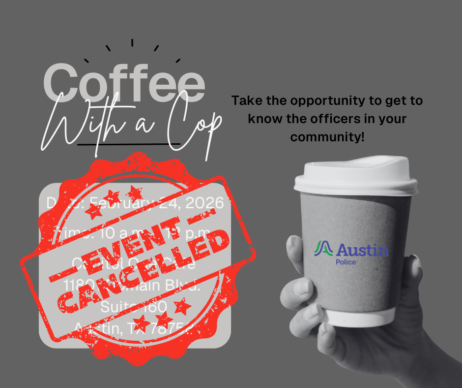 Tuesday, February 24, 2026 - 10:00 AM to 12:00 PM Location Information Capitol One Cafe 11801 Domain Blvd. Austin, TX 78758 United States See Map: Google Maps Contact Information APD Office of Community Liaison 5129744700 Email