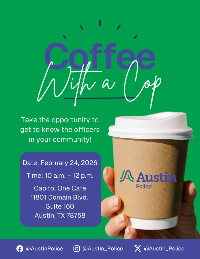 Tuesday, February 24, 2026 - 10:00 AM to 12:00 PM Location Information Capitol One Cafe 11801 Domain Blvd. Austin, TX 78758 United States See Map: Google Maps Contact Information APD Office of Community Liaison 5129744700 Email