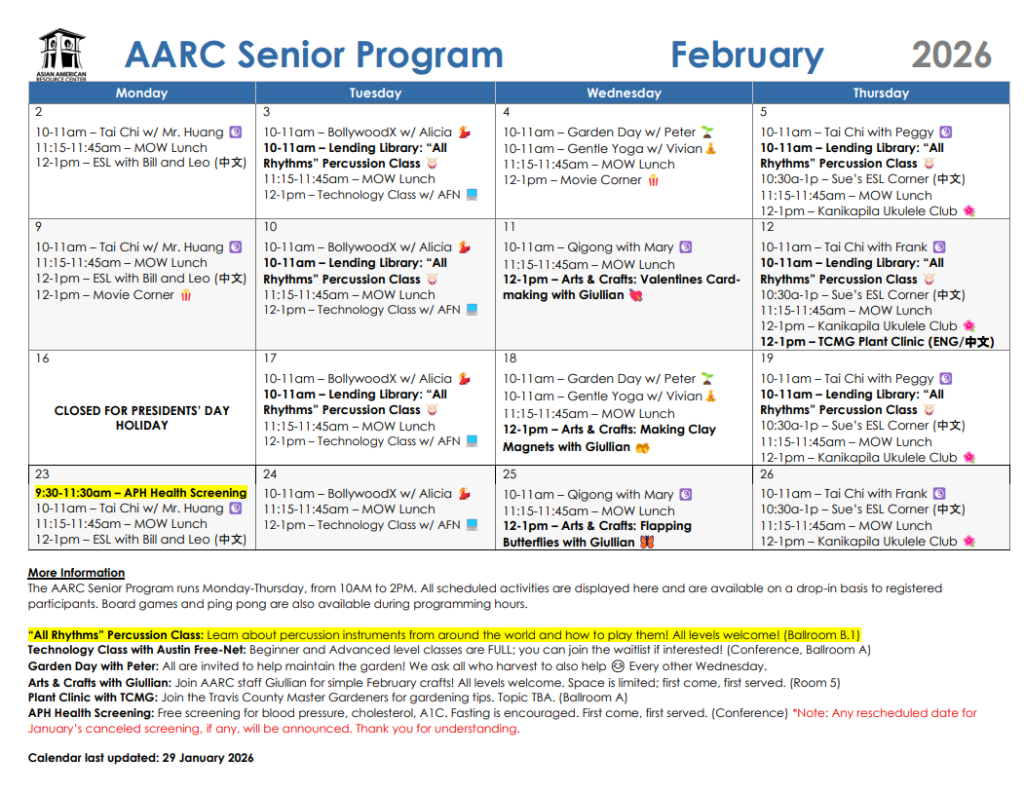 AARC Senior Program is designed to address the intergenerational wellness and education needs of Austin residents, age 50 and up, with a focus on Asian American culture and community. AARC Senior Program is part of the Congregate Meal Program with Meals on Wheels (MOW) and Austin Parks and Recreation (APR) Senior Transportation.